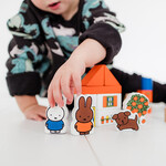 Everything is possible with the 50 wooden blocks in cheerful colors from this Miffy block barrel. Create the world of Miffy yourself: build the house of the Pluis family and play with melanie and Snuffiy.
