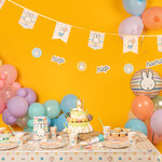 Letterslinger ”hiep hiep hoera!”, 2,65 meter lang met 4 figuren, diameter figuur: +/-12cm , diameter tekst: +/- 10cm, eenzijdig bedrukt, verpakt in polybag met header.
